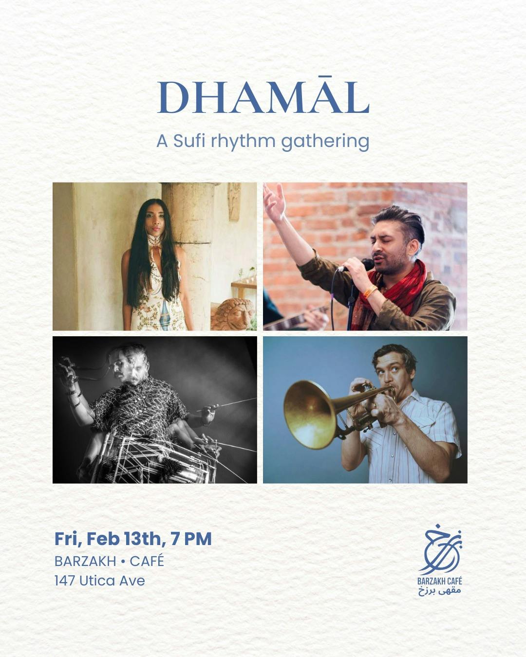 DHAMĀL is a percussion-led Sufi rhythm gathering rooted in South Punjabi and Sindhi traditions, where listening naturally spills into movement. The evening begins with a focused set- Sufi voice, dhol, tabla, and trumpet- before opening into a shared space (open jam) shaped by repetition, pulse, and collective energy.